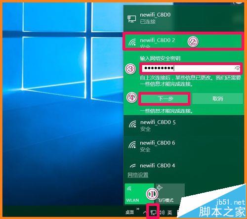 8、下面的操作是登錄無線網絡:①點擊系統桌面右下角的網絡圖標,②點擊newifi_C8D0 2(其它的也可以),③在輸入網絡安全密鑰欄中輸入我們設置的密碼,④點擊:下一步;