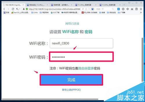 4、網絡已連接,進入設置WiFi名稱和密碼操作,名稱newifi_C8D0(C8D0由路由器決定)是默認的,在WiFi密碼欄輸入密碼(密碼必須記錄下來備用),再點擊:完成;
