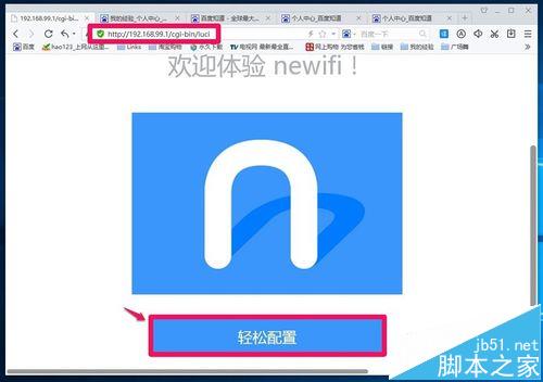 1、打開瀏覽器,輸入:192.168.99.1(或newifi.com),回車,在顯示的歡迎體驗newifi窗口,點擊:輕松配置;