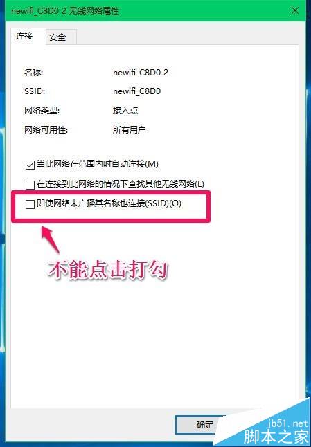 注意:newifi_C8D0 2無線網絡屬性 - 連接下的【即使網絡未廣播其名稱也連接(SSID)】不能點擊打勾,否則無線網絡不能連接到Internet。