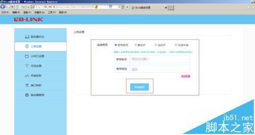 2、必聯BL-AC1200雙無線路由器上網設置:根據自己的需求選擇連接類型,我選擇的是寬帶撥號,輸入電信運營商給的寬帶賬號和密碼,開始撥號就可以連接上網了。