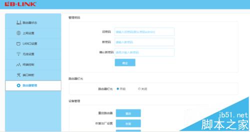 5、必聯BL-AC886M路由器管理,在這里可以更改管理員密碼、設置路由指示燈的開關,也可以重啟路由器,恢復出廠設置等等。