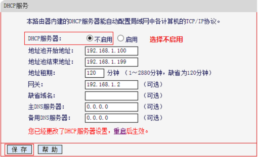 步驟五、關閉DHCP服務器在水星MW3030R的設置界面,點擊“DHCP服務器”——>“DHCP服務設置”——>“DHCP服務器”選擇:不啟用——>點擊“保存”并重啟路由器。