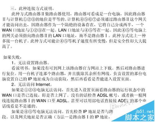 此種方式將路由器Ⅱ當作集線器(HUB)使用,在某種意義上來說可以看成是透明的。因此所有的計算機的地位是平等的,訪問局網共享也毫無阻力。但此種方法會消耗掉2個LAN口,因此多加一個4口路由器只能最多接6臺電腦。因為路由器Ⅱ幾乎是透明的,因此接路由器Ⅱ的電腦的網關應該和①②③臺電腦一樣是路由器Ⅰ的IP地址,但是由于路由器Ⅱ的DHCP可能造成分配IP地址給④⑤⑥時把網關設置成自己,因此在上面需要指定一下。
