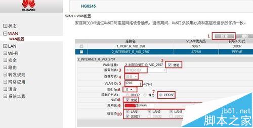 7、WAN連接:前面的“使能”復選框勾上服務列表:選“INTERNET”連接方式:路由VLAN ID:*(剛剛記下的數值用上了)802.1p:*