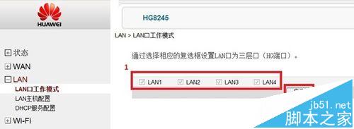 4、設置HG8245。在主頁的左邊有樹狀列表。選第三項LAN-->LAN口工作模式,把右邊的LAN1,LAN2,LAN3,LAN4都勾上!點擊“應用”如果有開通IPTV 就記得留下一個端口,全勾上就不能看電視了!
