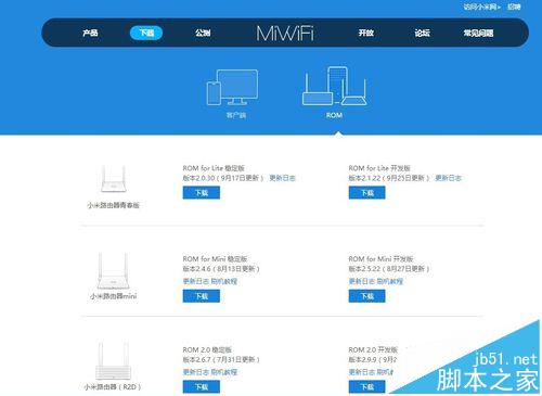 2、當(dāng)然,如果小米路由器出現(xiàn)嚴(yán)重的啟動(dòng)故障,則只能通過(guò)U盤(pán)刷機(jī)來(lái)解決。對(duì)此登陸小米路由器官方網(wǎng)站(miwifi.com),根據(jù)小米路由器的型號(hào),從“下載”-“ROM”選項(xiàng)卡界面中選擇下載相應(yīng)型號(hào)的ROM包。