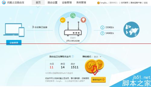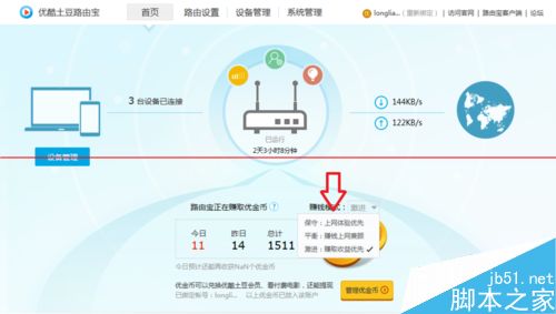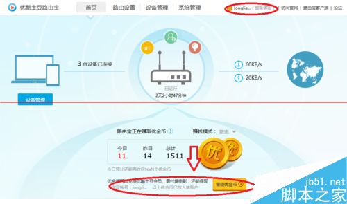 2、路由連上網以后要進行優酷賬號綁定,看圖所指,如果你使用優酷或者土豆看視頻,就非常流暢,可以根據自己上網的情況選擇賺錢模式。