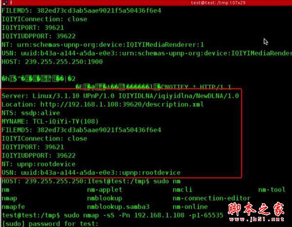 首先測(cè)試兩臺(tái)安卓設(shè)備,發(fā)現(xiàn)其中一臺(tái)開放端口很多,隱隱約約中感覺是一臺(tái)小米盒子或者百度影棒這種產(chǎn)品,這樣事情就變得有趣了,因?yàn)榭刂齐娨暱删陀袡C(jī)會(huì)了。