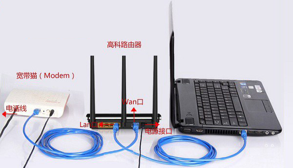 高科路由器與其它路由安裝方法一樣,首先需要將路由器的WAN口連接到貓(Modem)Lan口,如果是光纖用戶,沒有貓的話,光纖網線直接插入路由器的WAN摳即可。