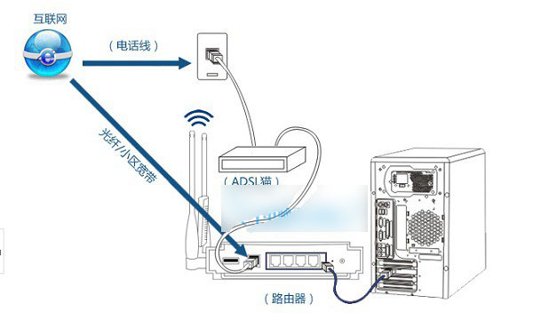如圖,如果是帶有貓的ADSL撥號上網用戶,外部網線先插入貓,然后另外接口用網線與思科路由器WAN口連接,LAN口用網線與電腦連接。另外如果是光纖或者小區寬帶,沒有貓設備,則外部網線直接插入思科路由器的WAN口即可,其它相同。