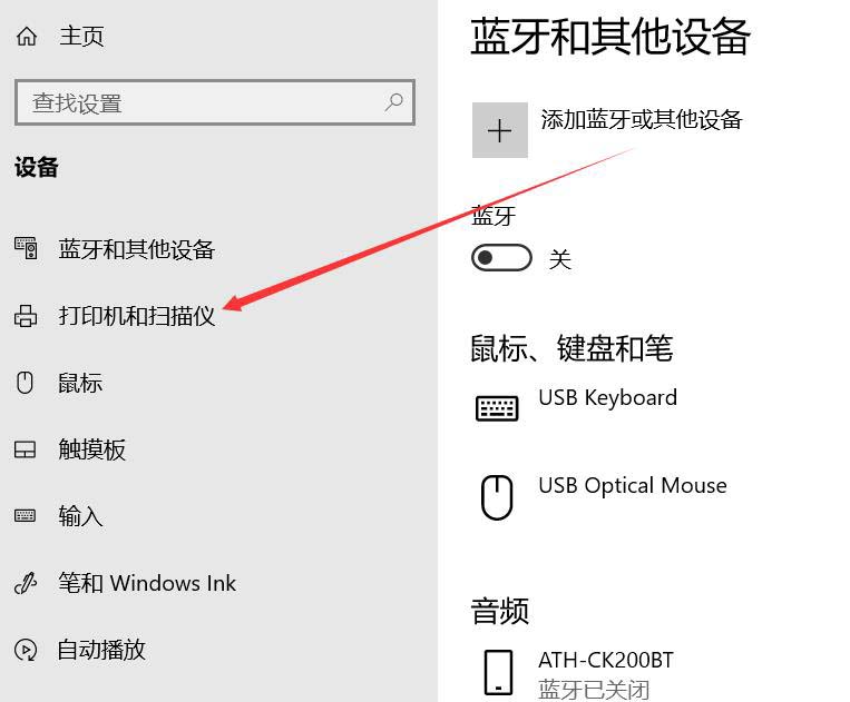 4、點擊左側的“打印機和掃描儀”選項。