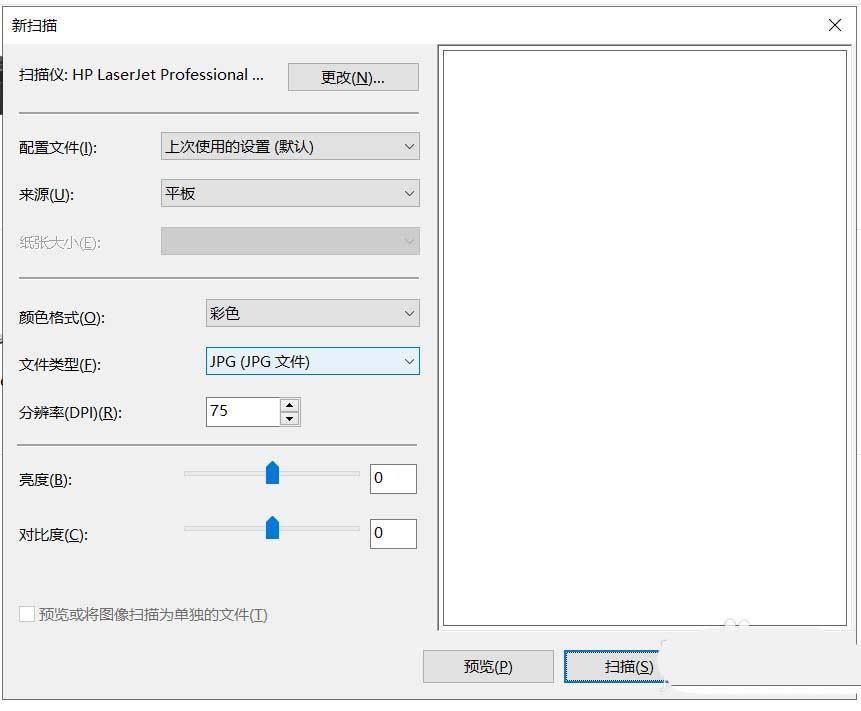 3、打開掃描設(shè)置選項(xiàng)后,選擇掃描儀和配置文件,來源選項(xiàng),顏色選擇彩色,文件類型選擇JPG格式,打開預(yù)覽選項(xiàng),設(shè)置合適的分辨率,亮度,對(duì)比度;