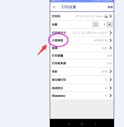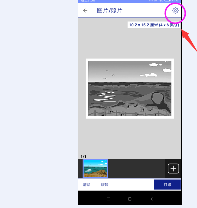 點擊圖片/照片按鈕,隨便的選擇一張圖片,然后在其右上角會看到設置的齒輪圖標,點擊后進入打印設置 界面,找到介質類型,選擇 愛普生超光澤紙,即可完成操作。這樣打印出來的圖片質量,就會大大增加!