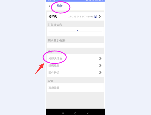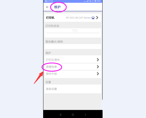 當發生上述問題時,我們可以先打開Epson iPrint ,然后點擊上方已經添加的打印機圖標,選擇維護--噴頭檢查,對噴墨情況進行一下檢測,發現藍色墨水出現斷墨現象,說明用藍色墨水的連供出現問題。