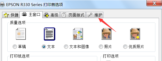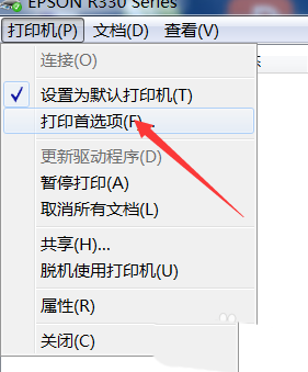 2、進入EPSON R330 Series界面,單擊菜單:打印機-首選項,彈出對話框選擇維護。