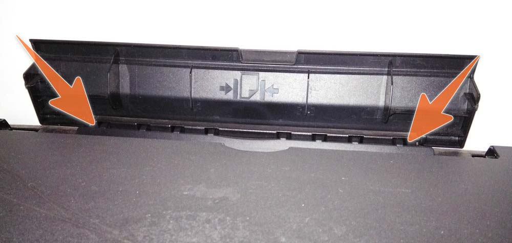1、這款打印機的進紙口還是很普通的,在打印機上方的前邊處,是一個長方形的蓋板,把它揭開,紙張放在正中間即可,左右還有兩個滑塊,可根據紙大小,進行調節。
