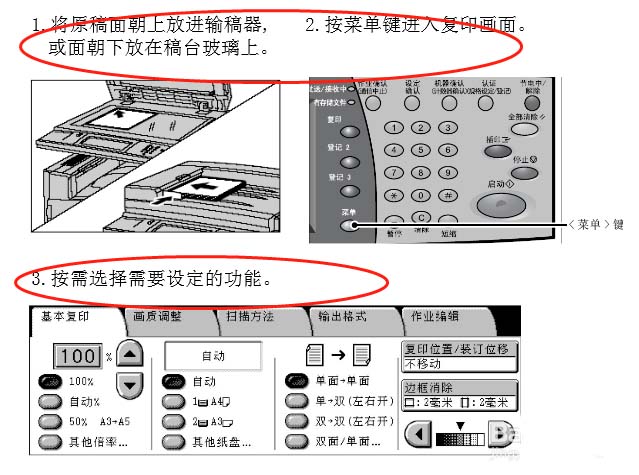 1、先將原稿面朝上放進輸稿器或者原稿面朝下放入稿臺玻璃,按菜單上面進入設置按鈕,設定所需要的功能,然后選擇張數,進行復印。