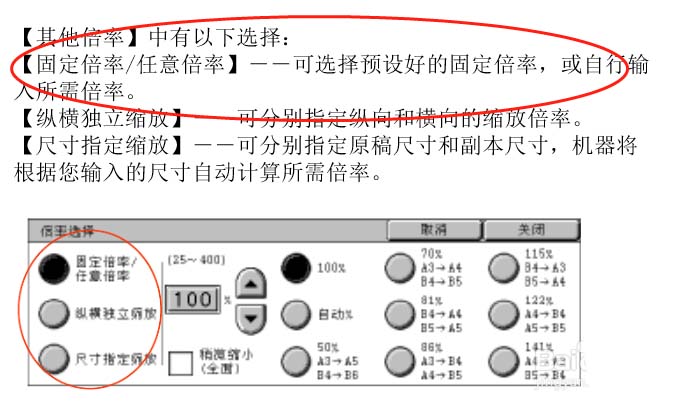 放大或者縮小復印:在基本復印畫面上選擇要進行縮放或者放大的倍率,進行操作,如圖所示:
