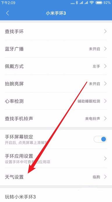 4、接下來在打開的小米手環3的設置頁面中,找到并點擊“天氣設置”菜單項。
