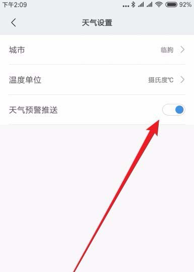 5、在打開的天氣設置頁面中,可以看到“天氣預警推送”的設置項。