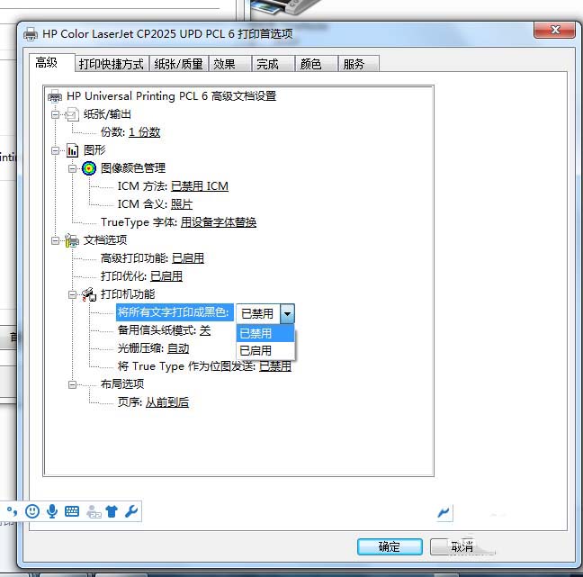 2、擊右鍵,打印機首選項——將所有文字打印成黑白=已禁用。這樣打印出來的文字就是彩色的。否則是黑白的