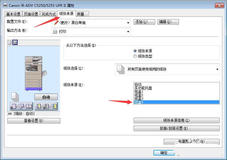 5、在紙張來源里右下方可以看到里面有幾個選項:自動、多功能托盤、紙盒1、紙盒2等,然后選擇你要的來源,點“確定”,這樣就選好了紙張來源