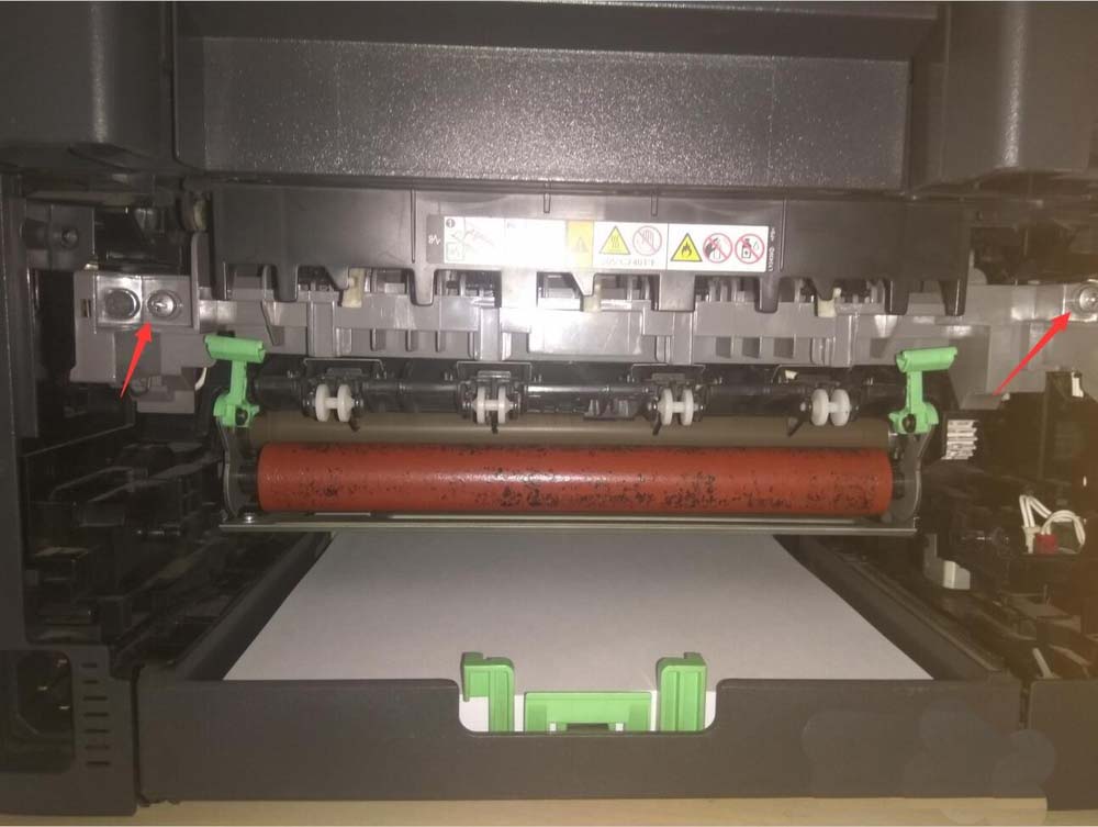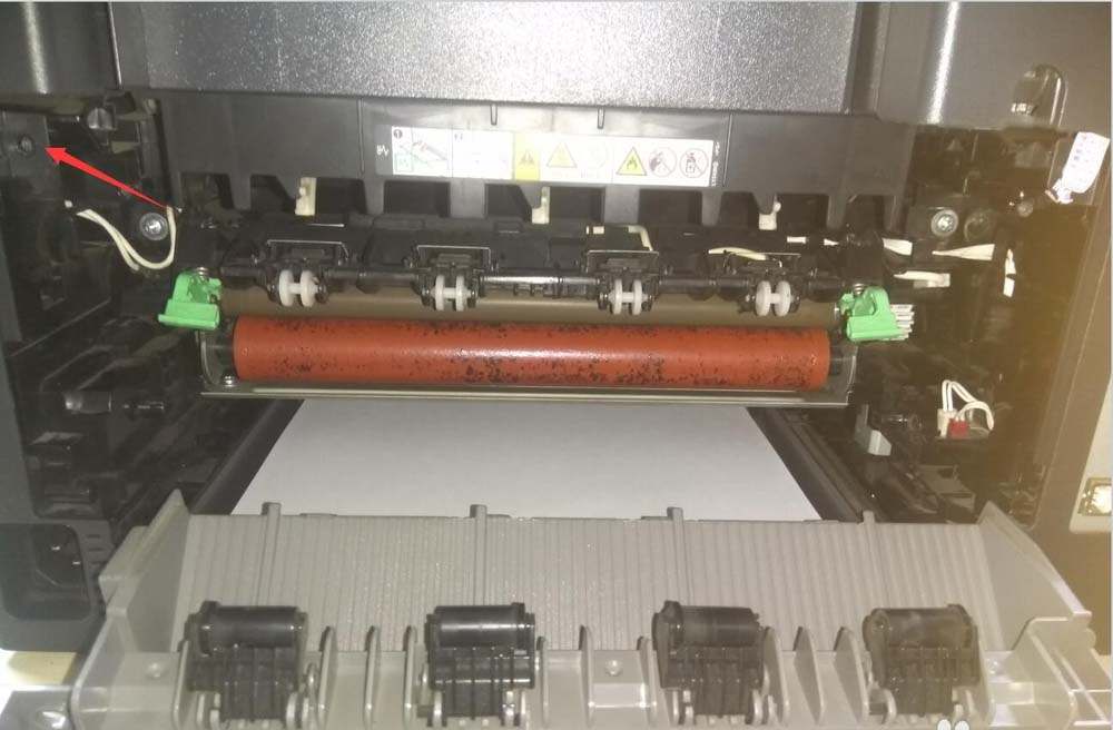 6、去掉圖中的螺絲,然后取出前面的硒鼓。