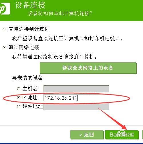 3、點擊確定,進入設備連接選項。選擇“通過網絡連接”、“輸入IP地址”。