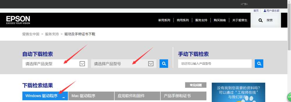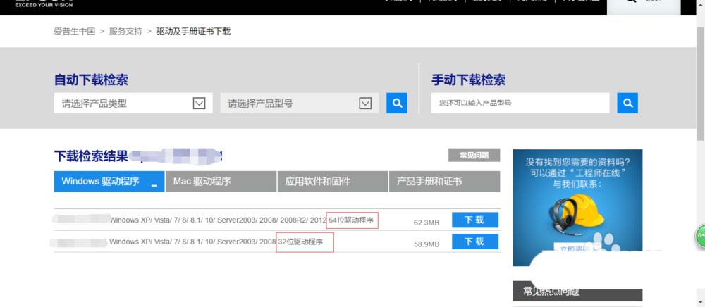 2、在“下載搜索結(jié)果”中選擇正確的操作系統(tǒng),在“請(qǐng)選擇產(chǎn)品類型中”選擇正確的打印機(jī)類型,在“請(qǐng)選擇產(chǎn)品型號(hào)“中找到對(duì)應(yīng)的型號(hào),確認(rèn)無誤后,點(diǎn)擊搜索(🔍)按鈕