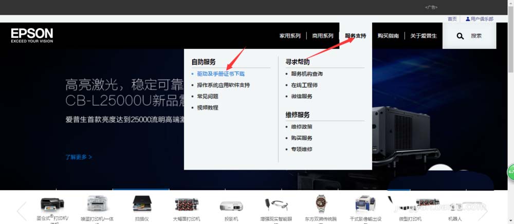 1、如果經(jīng)過上面的處理方法沒有成功的話,就需要登錄設(shè)備商的官網(wǎng)進(jìn)行驅(qū)動(dòng)程序的下載與安裝,可以使用百度搜索方式進(jìn)入官網(wǎng),在上方點(diǎn)擊“服務(wù)支持”-“驅(qū)動(dòng)及手冊(cè)證書下載”