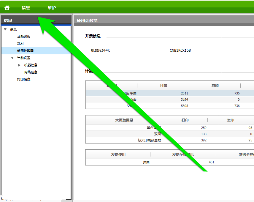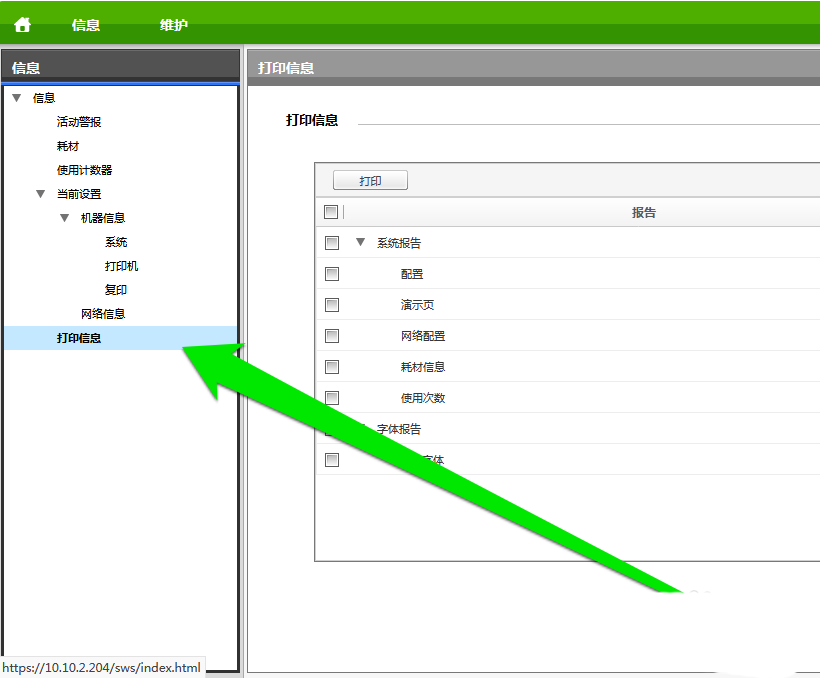 2、登錄打印機管理地址后,進入打印機的管理界面。我們在管理界面,點擊信息按鈕。
