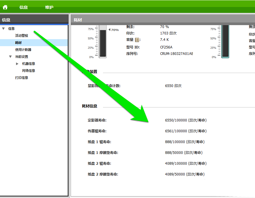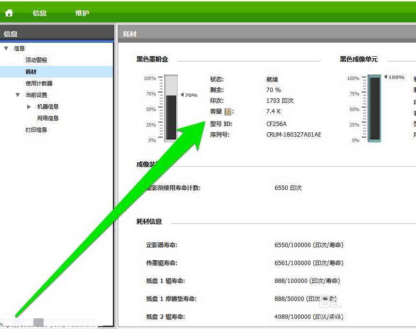 4、點擊耗材按鈕后,就可以看到打印機的碳粉,各種元件的使用壽命。