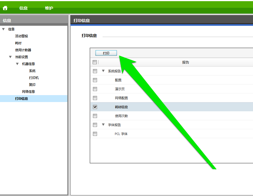 6、為了便于打印機耗材的存檔,我們選擇耗材打印按鈕。