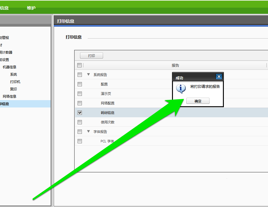 8、勾選好耗材按鈕后,點擊打印按鈕,系統顯示打印耗材報告完成。