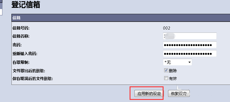 5、進(jìn)入登記信箱頁(yè)面后設(shè)置好郵箱名稱(chēng)和密碼后選擇“應(yīng)用新的設(shè)定”等待生效即可。