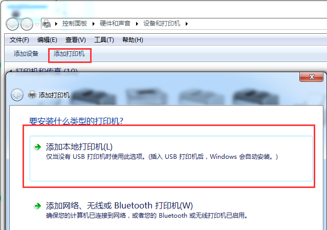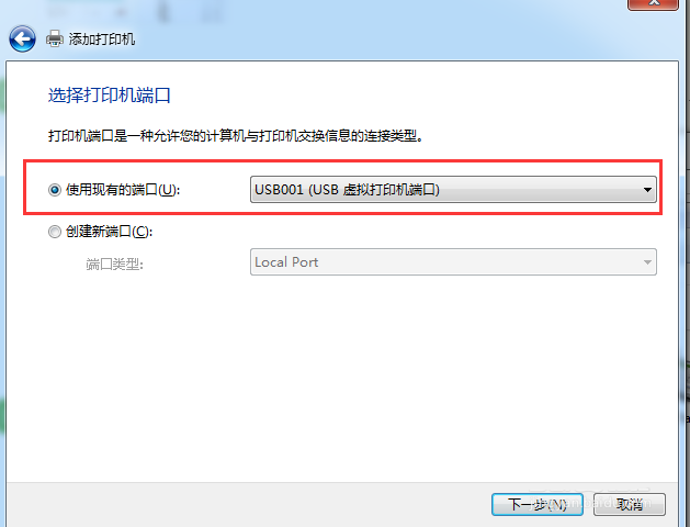 2、之后點擊“開始”-“設備和打印機”-“添加打印機”-“添加本地打印機”-“端口選擇,使用USB001(USB虛擬打印機端口)”,下一步。