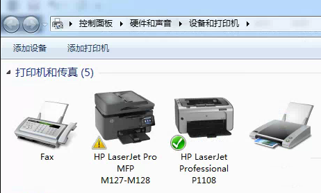4、安裝完成后在,“設備和打印機”中會有2臺打印機,一臺是M128fn打印機,一臺是P1108打印機,M128fn打印機會有錯誤警告,但是可以正常掃描無法打印,要將P1108設置成默認打印機,進行打印。