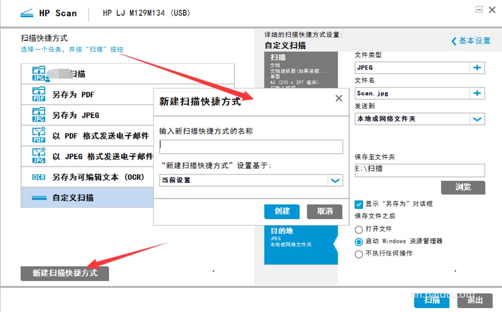 6、自定義掃描設置完成后,點擊新建掃描快捷方式。彈出新建掃描快捷方式窗口,然后輸入掃描快捷名稱,以后就選擇我們自定義的掃描進行掃描,掃描文件自動存儲到指定目錄下,即E:/掃描。