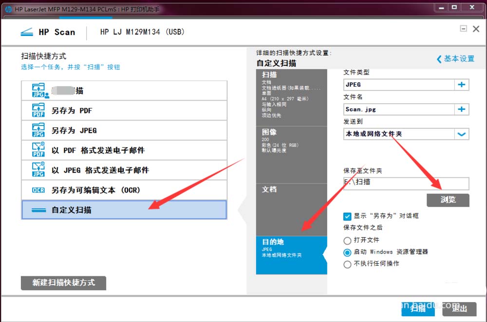 5、選擇目的地,然后點擊瀏覽,我這里選擇了E:/掃描做為掃描件的默認路徑,以后掃描的文件就自動存儲到E:/掃描目錄下。