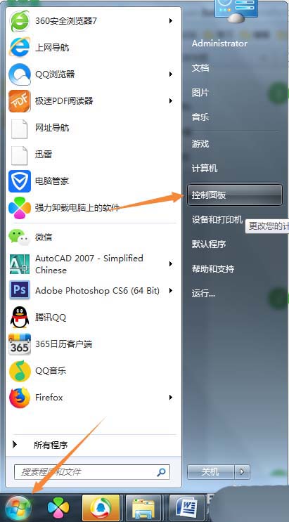 2、如果在'開始'中未能看到'設備和打印機',可以按如下操作。點擊電腦左下角'開始',然后選擇'設備和打印機'。