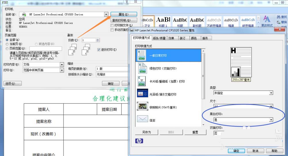 6、最后我們來看看,打印文檔的時候,點擊屬性,可以看到黑白打印處已經默認的顯示為是。