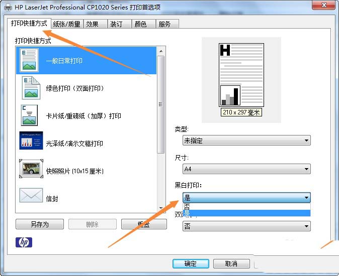 5、在打開的窗口中,黑白打印欄選擇'是',然后點擊確定即可。