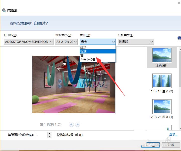 5、設置打印出來照片的尺寸,如果是一張紙打印多份就要進行重新排版了,也可以使用分頁功能。
