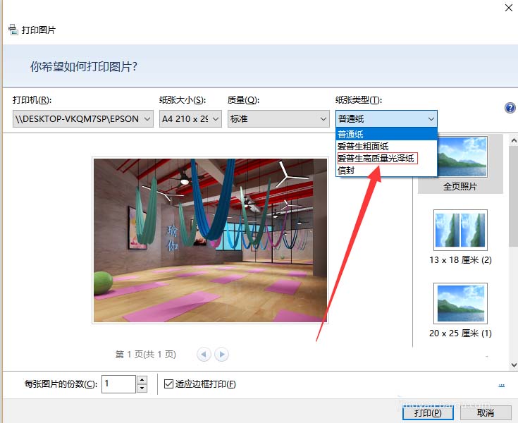 2、在上方的紙張類型點擊選擇相紙,也就是愛普森高質量光澤紙