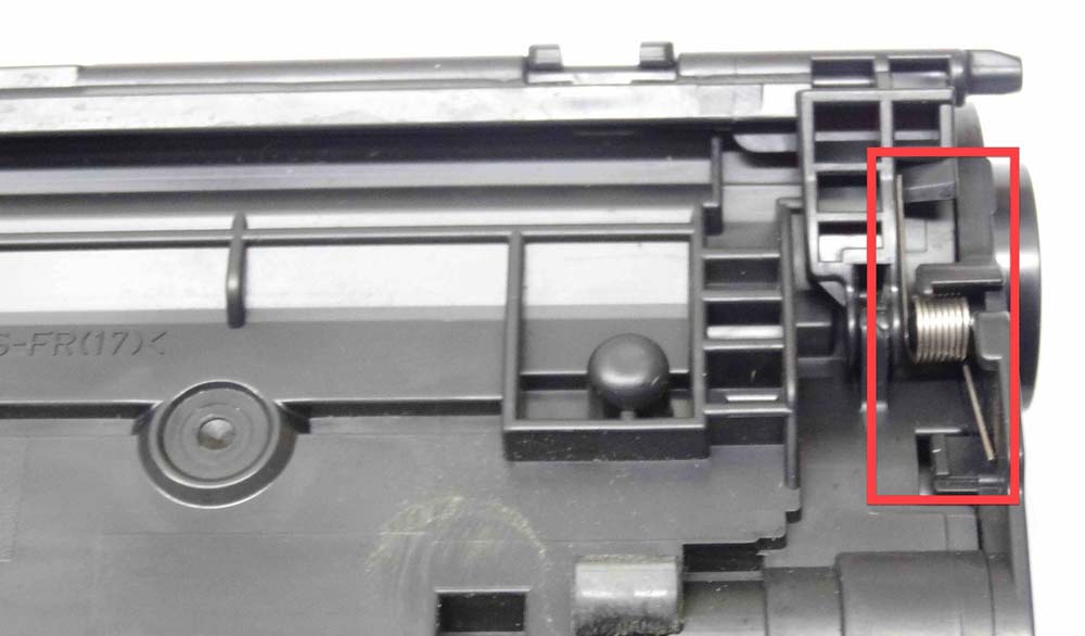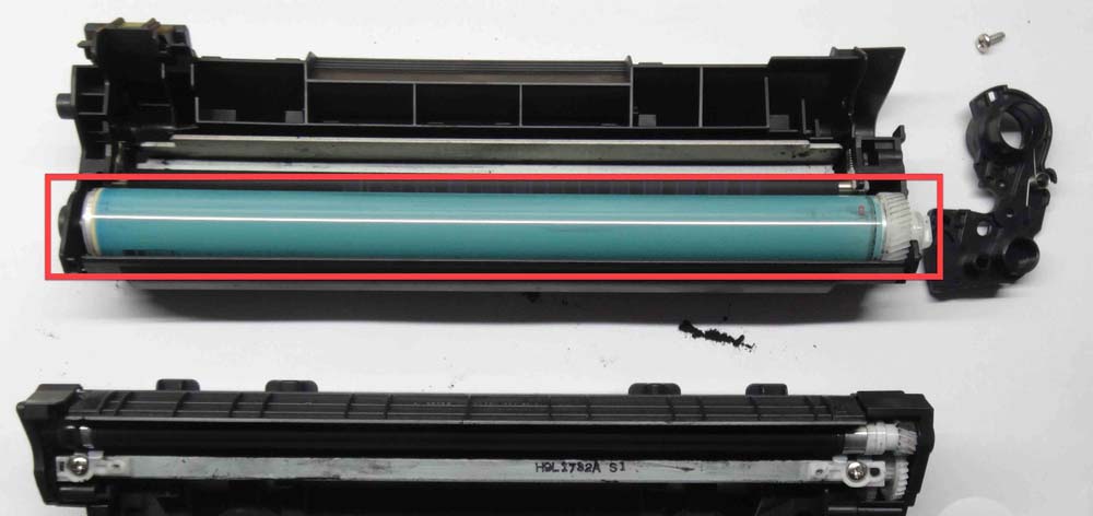 1、將硒鼓有齒輪的一側豎起,將紅圈指示的螺絲擰開。