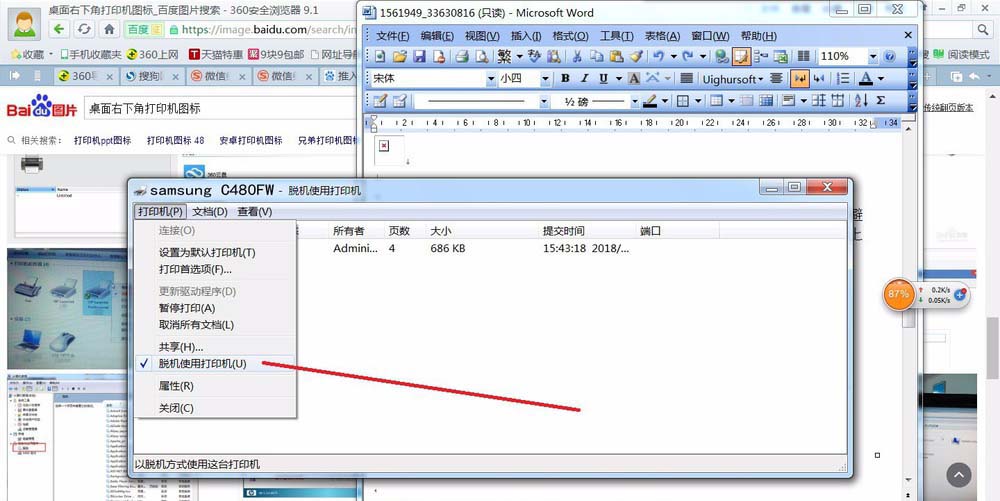 1、點擊右下角打印機圖標→出現打印機窗口時點主菜單打印機→把脫機使用打印機前面的√去掉(即點一下這一行就OK)