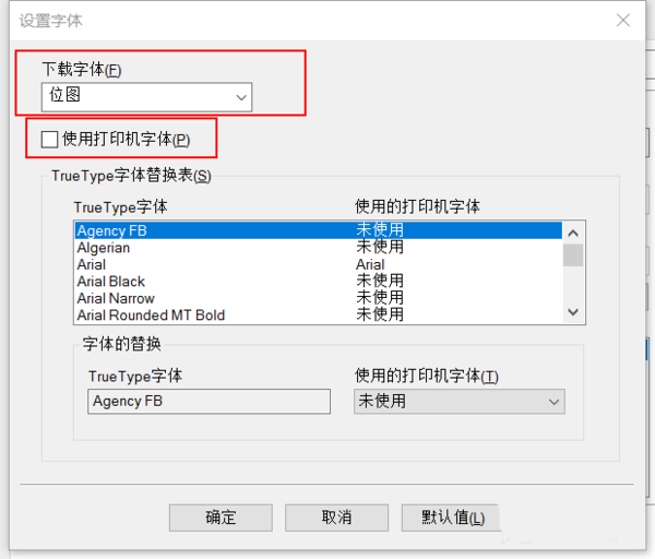 6、下載字體里選擇位圖,使用打印機字體前面的勾取消,一直確定到設備打印機,這樣就不會亂碼了,第二步重復操作為的是給他改成默認這個設置