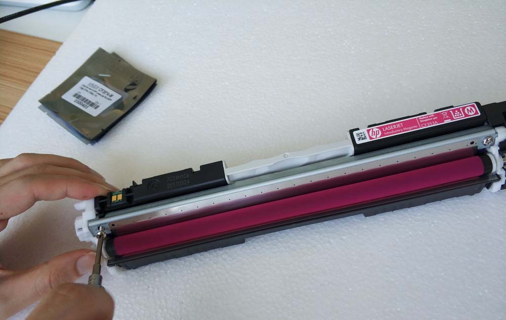 3、白色端蓋一側(cè)的螺絲擰下來 ,取下白色端蓋 ,注意平放硒鼓,粉會灑出來,再取下金屬擋板