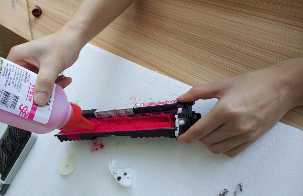 4、找到相對應(yīng)顏色的粉盒,小心添加 , 到最后 左右搖擺一下硒鼓,弄平整粉墨即可